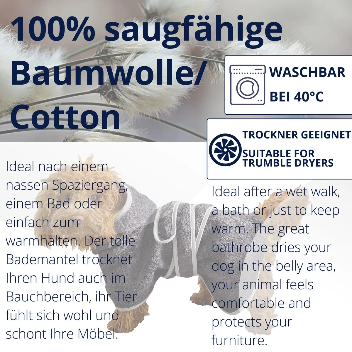 MAKKELIJKE REINIGING: De hondenbadjas kan gewoon in de wasmachine op max. 40 graden. Ook geschikt voor de droger.